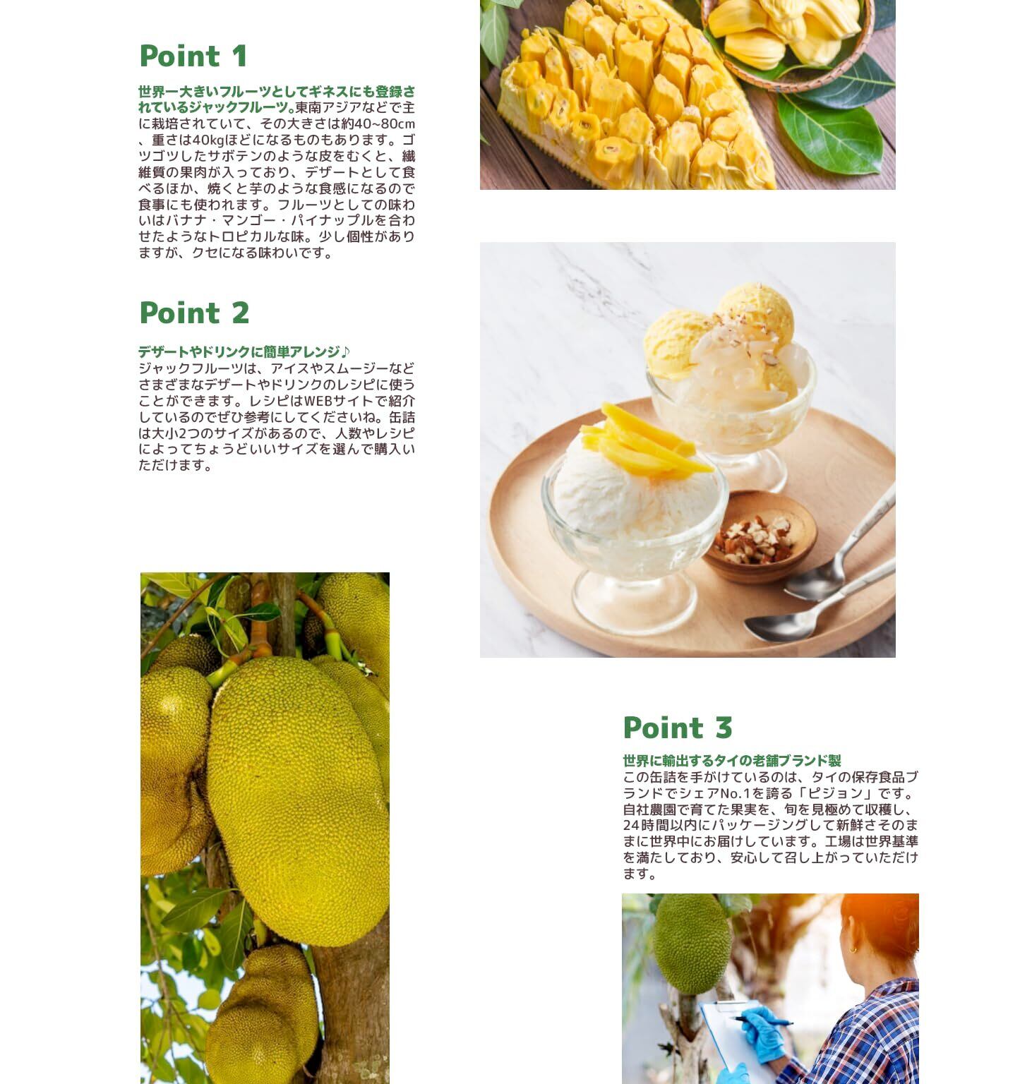 ジャックフルーツ:タイ産・ジャックフルーツの缶詰です。 ジャックフルーツの実は、種を抜いたピーマンのような形をしており、パイナップルやバナナのような香りと甘みを持つ南国フルーツです。日本ではなかなか食べる機会の少ないフルーツ、ぜひお試しください。