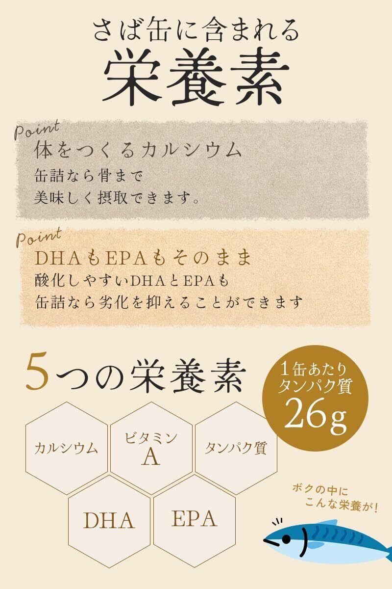 DHA・EPA、カルシウム、タンパク質などさばに含まれる栄養素を美味しく手軽にお食事に取り入れられます。 缶詰なので参加しやすいDHAとEPAを劣化を抑えて摂取できます。 タンパク質は1缶あたり26g含まれています。