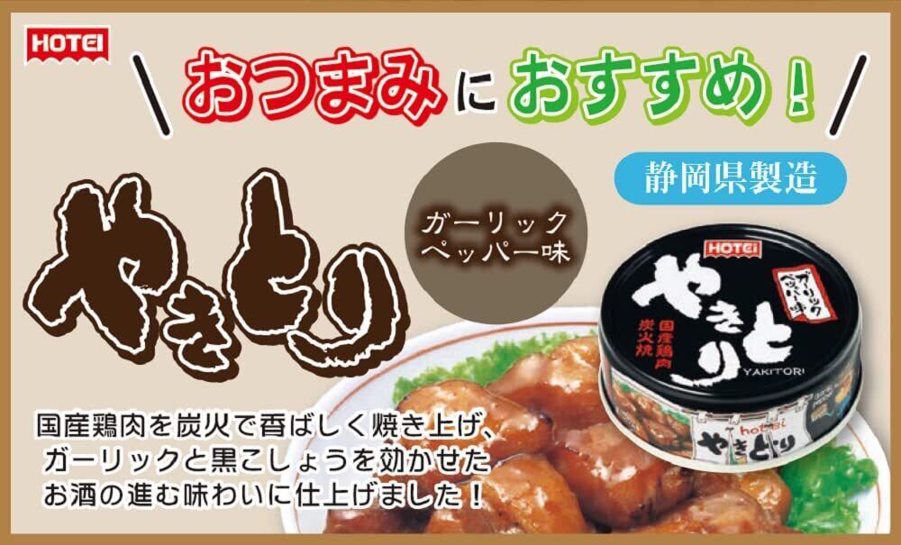 国産鶏肉を炭火で焼き上げた「ホテイのやきとり」。たれ味は、甘くて濃厚な秘伝のたれに焦がし醤油を加え、より香ばしく美味しくなりました。塩味は、さっぱりと素材の旨みを活かして仕上げました。ガーリックペッパー味は、にんにくと胡椒が効いた焼肉のたれのようなおいしさです。塩レモン味は、塩味をベースにレモン果汁で爽やかに仕上げました。 ビールのおつまみやちょっとした夜食にも便利です。賞味期間が長く常温保存できますので、いざというときの栄養源として防災備蓄用にもオススメです。