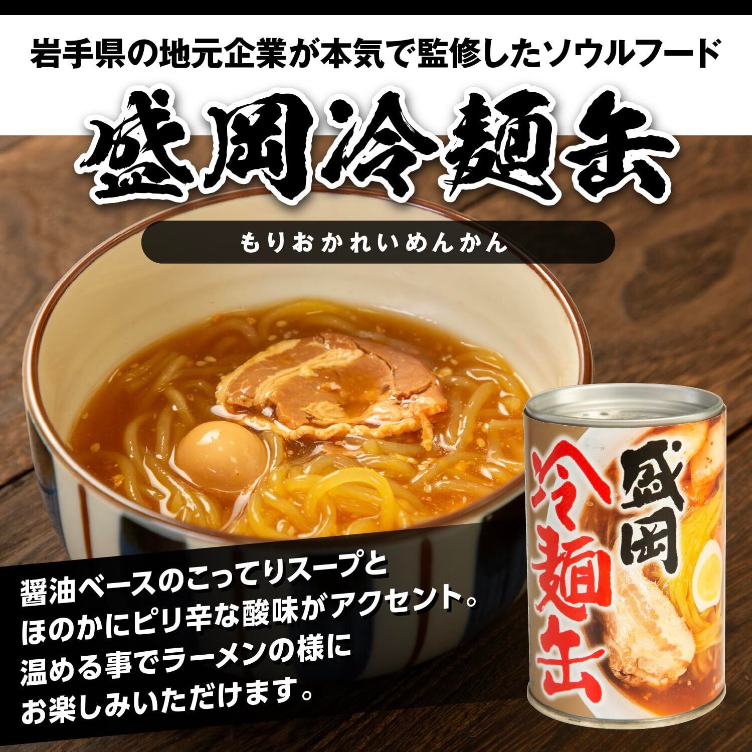 岩手のグルメ盛岡冷麺を、調理不要、持ち運び便利な缶詰で再現しました。コクや旨みがたっぷりのスープにカロリーを考え。コシの効いた麺とツルッとした喉ごしのコンニャク麺を使用。スープは辛みとやや酸味の効いたあっさり味。豚肉のチャーシューに小さめのうずらの卵のトッピングで手軽に冷麺をお楽しみください。