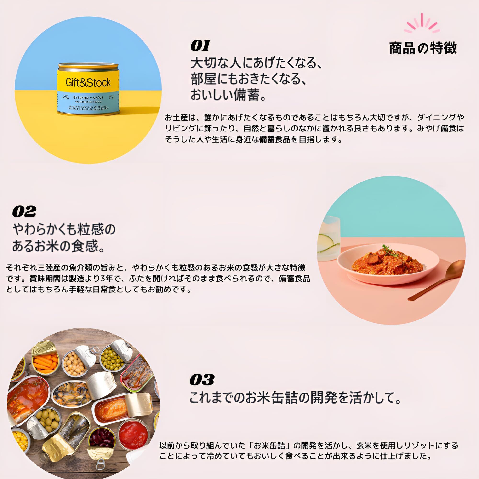 みやげ美食プロジェクトで生まれた缶詰それが「GIft&Stock」大切な人にプレゼントしたくなる災害備蓄として美味しく明るい気持ちになるそんな備蓄品を目指し開発致しました。炭水化物と脂質に頼りがちな備蓄食品に健康を考えビタミンやミネラル成分の多い食品で製造、温めなくても美味しくいただけます。