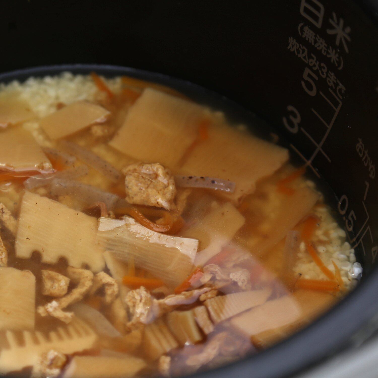 【お召し上がり方】1.2合の洗ったお米と、「たけのこの炊き込みご飯の素」1缶を炊飯器に入れてください。2.水を2合の目盛りまで足してください。3.白米と同様に炊いてください。