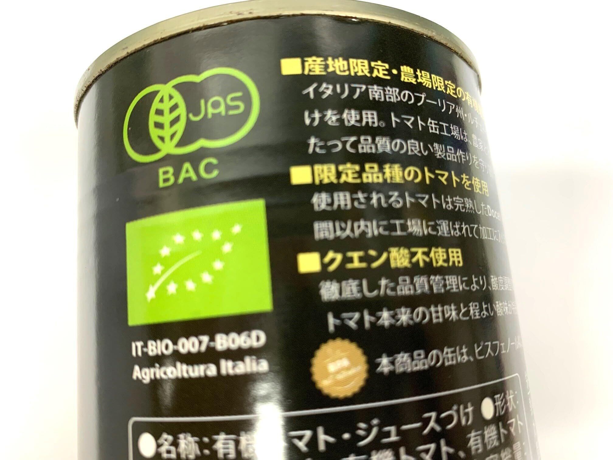 イタリア南部のプーリア州・ルチェーラにある限定農場で栽培された有機トマトだけを使用したダイス、クエン酸不使用