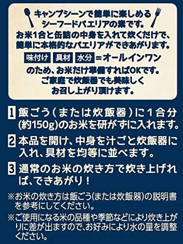 キャンプシーンで簡単に楽しめるシーフードパエリアの素です。お米1合と缶詰の中身を入れて炊くだけで、簡単に本格的なパエリアができあがります。「味付け」「具材」「水分」=オールインワンのため、お米だけ準備すればOKです。ご家庭で炊飯器でも美味しくお召し上がり頂けます。