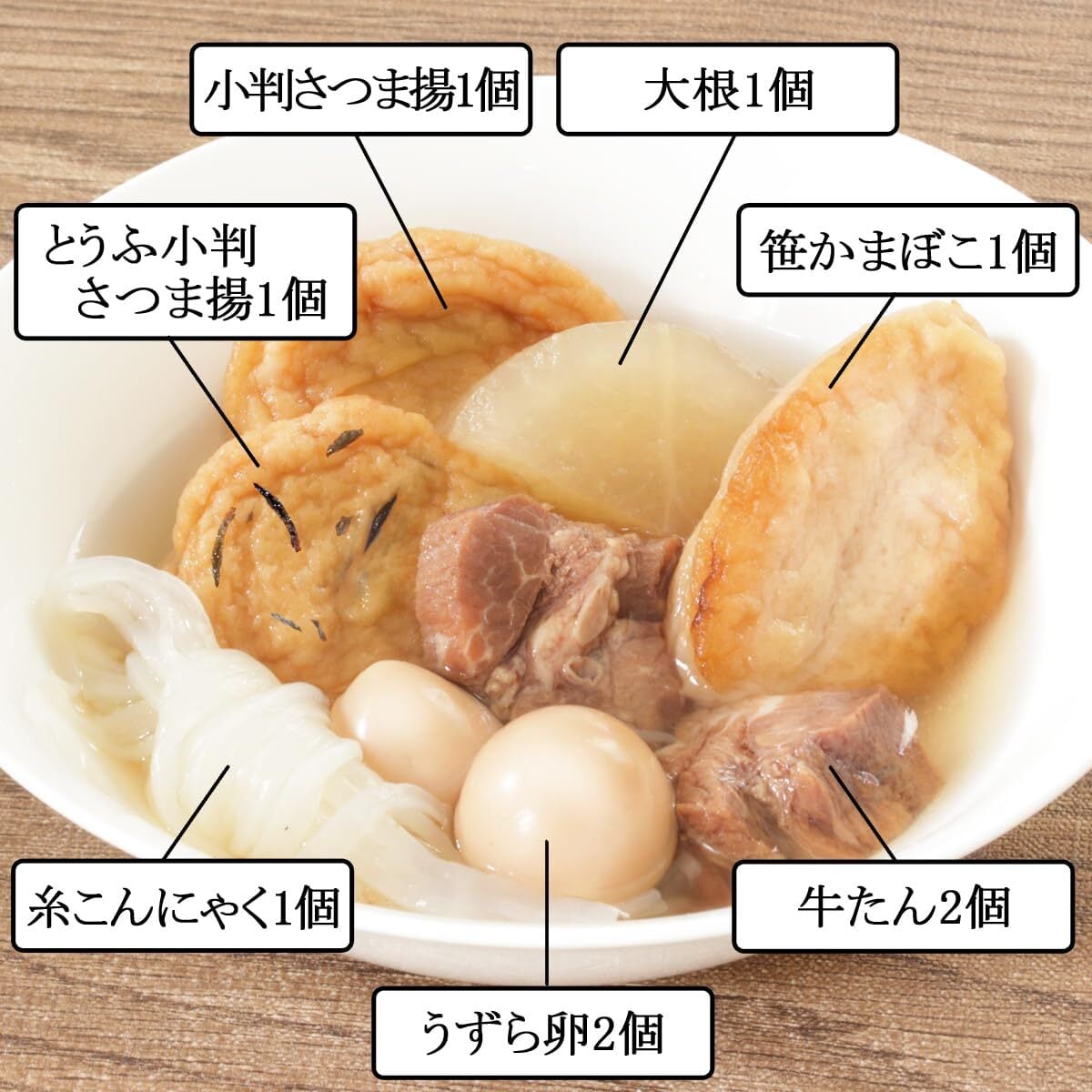 【内容】牛たん2個、笹かまぼこ1個、大根1個、糸こんにゃく1個、うずら卵2個、小判さつま揚 1個、とうふ小判さつま揚 1個(※本品は、卵・小麦・牛肉・大豆を含みます。)