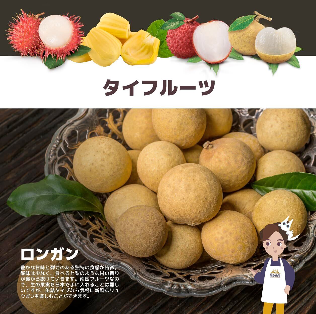 ロンガン:タイ産のロンガン(龍眼)の缶詰です。トロピカルフルーツのロンガンは白く透明で小ぶりな果肉と豊かな甘味で現地では大人気のフルーツです。 弾力がありながらも少しシャクシャクとした食感で、梨のような甘味が広がります。