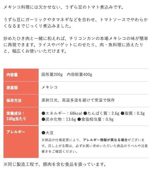内容量 固形量200g 内容総量400g 原産国 メキシコ 保存方法 直射日光、高温多湿を避けて常温で保存 栄養成分: 100g当たり ●エネルギー:68kcal ●たんぱく質:2.6g ●脂質:0.3g ●炭水化物:13.6g ●食塩相当量:0.9g アレルギー ●大豆 ※商品の仕様変更により、アレルギー情報が異なる場合がございます。召し上がる際は、必ずお買い求めいただいた商品のラベルや注意書きをご確認ください。 ※同じ製造工程で、豚肉を含む食品を扱っています。