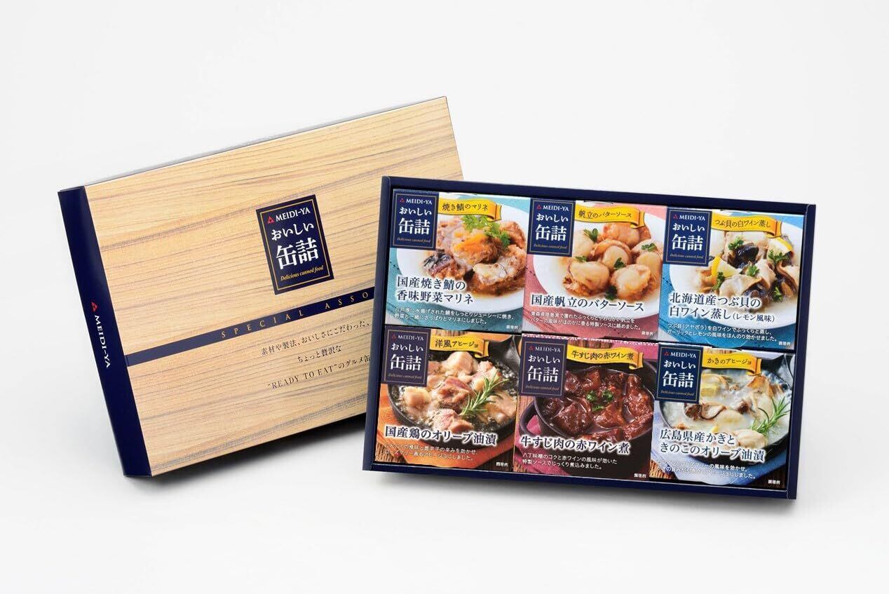 明治屋の「おいしい缶詰6種セット」です。 化粧箱付きでギフトにも最適です。