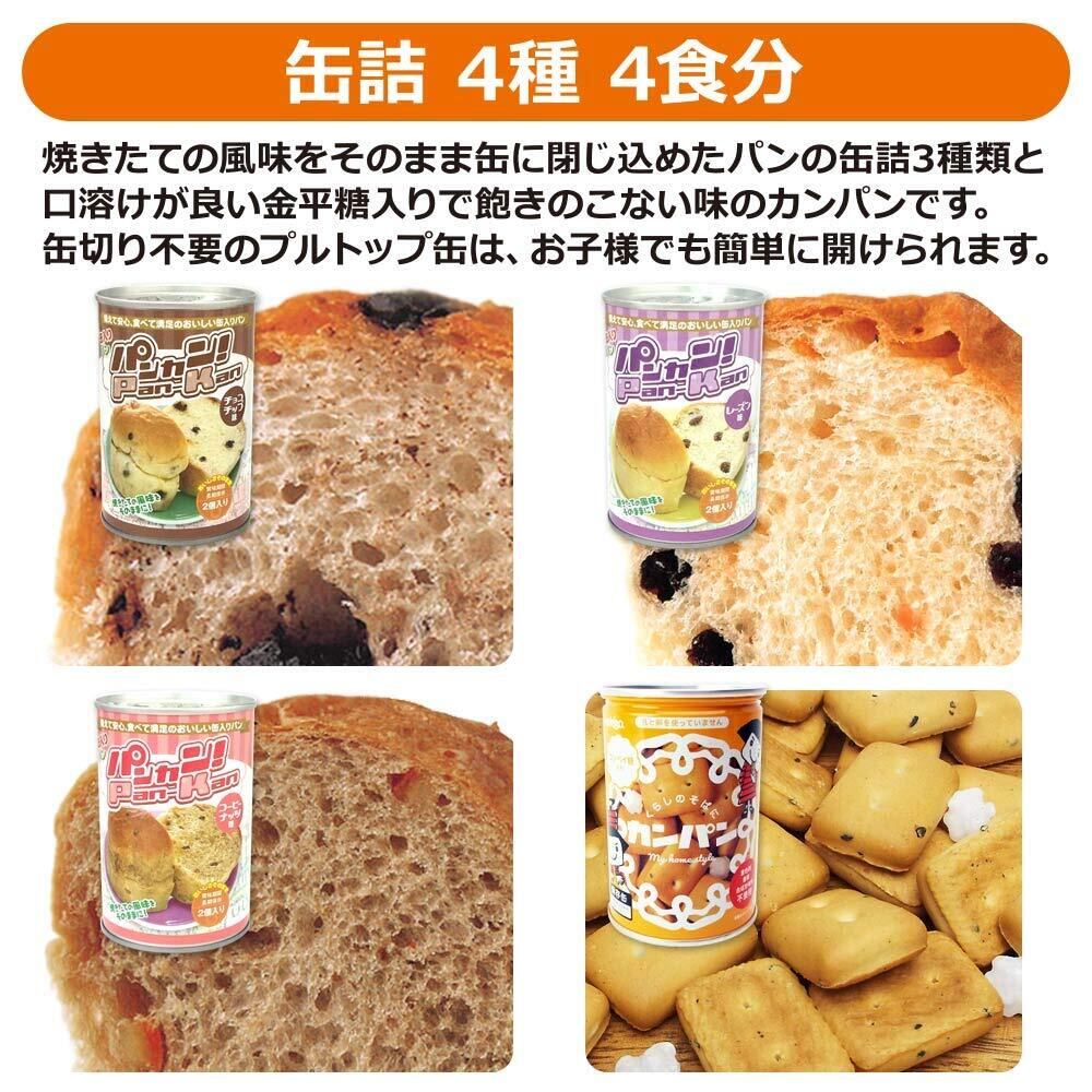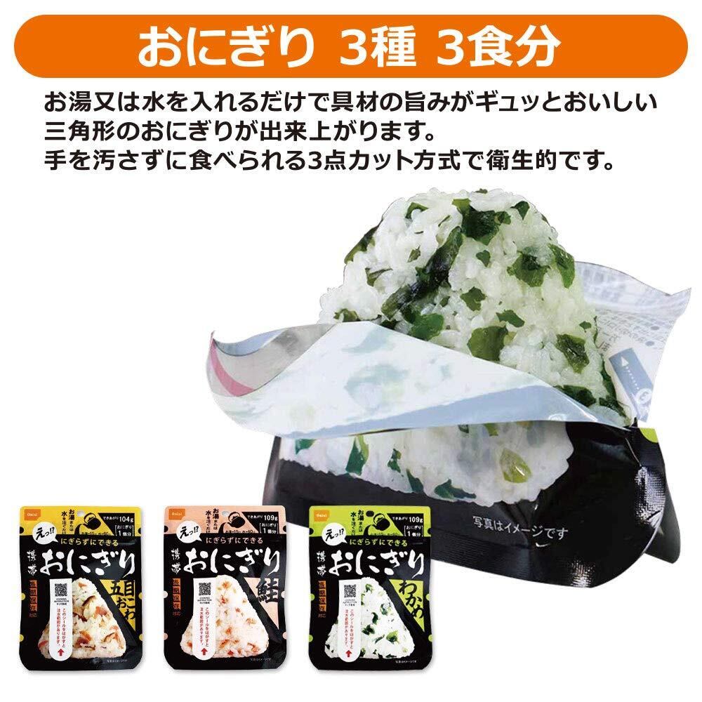 おにぎり:鮭、わかめ、五目おこわ/各1袋 パンの缶詰:チョコチップ、レーズン、コーヒーナッツ/各1缶 金平糖入りカンパン/1缶 ※セット内容は在庫状況等によって、メーカー等変更になる場合もございます。