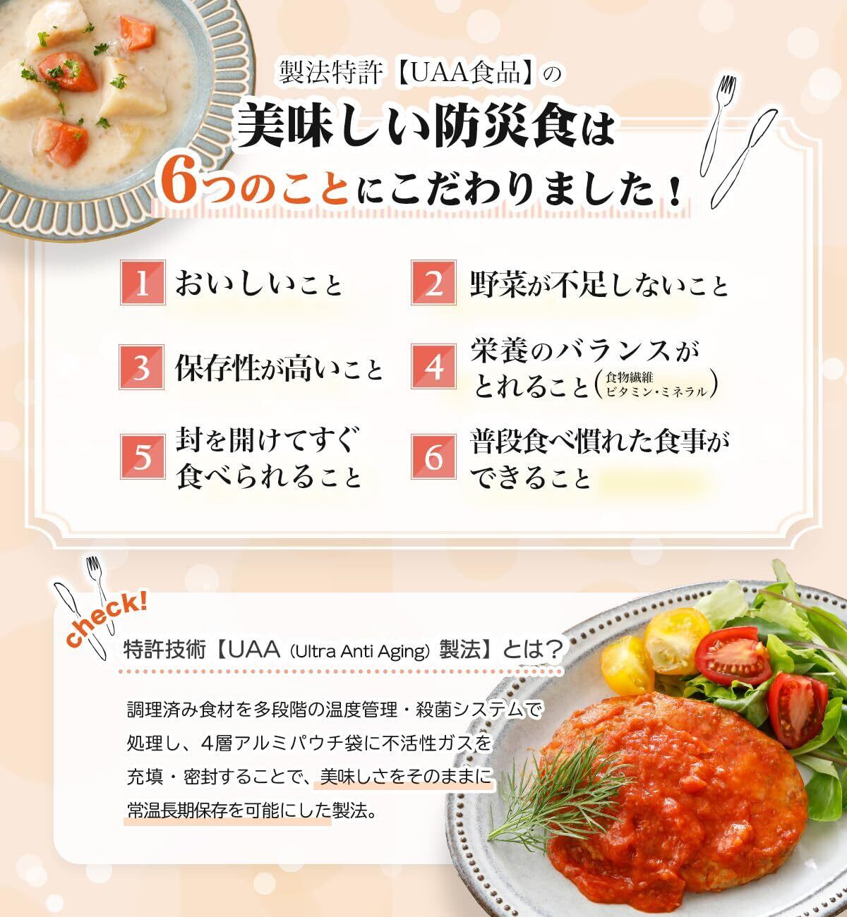 被災時でも、いつも食べているご飯を食べたいという声のもとに作られた長期保存非常食「美味しい防災食」おかず6種類×各2をセットにしました。災害時に備えて備蓄食料としてはもちろん、保存食、防災、非常用食料、アウトドアなど様々なシーンで!