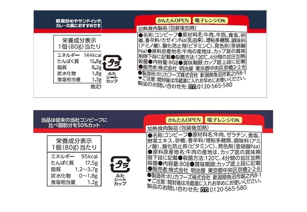 【コンビーフ】牛肉,牛脂,食塩,砂糖,香辛料/カゼインNa(乳由来),増粘多糖類,調味料(アミノ酸),酸化防止剤(ビタミンC),発色剤(亜硝酸Na)【脂肪の少ないコンビーフ】牛肉,ゼラチン,食塩,野菜エキス,砂糖,香辛料/増粘多糖類,調味料(アミノ酸),酸化防止剤(ビタミンC),発色剤(亜硝酸Na)