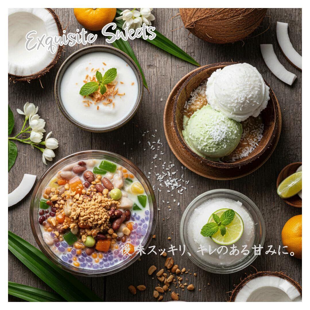 砂糖不使用なので、甘さの調節が自由自在。ココナッツプリン、ゼリー、パンケーキの生地など、幅広いスイーツ作りに活用可能です。