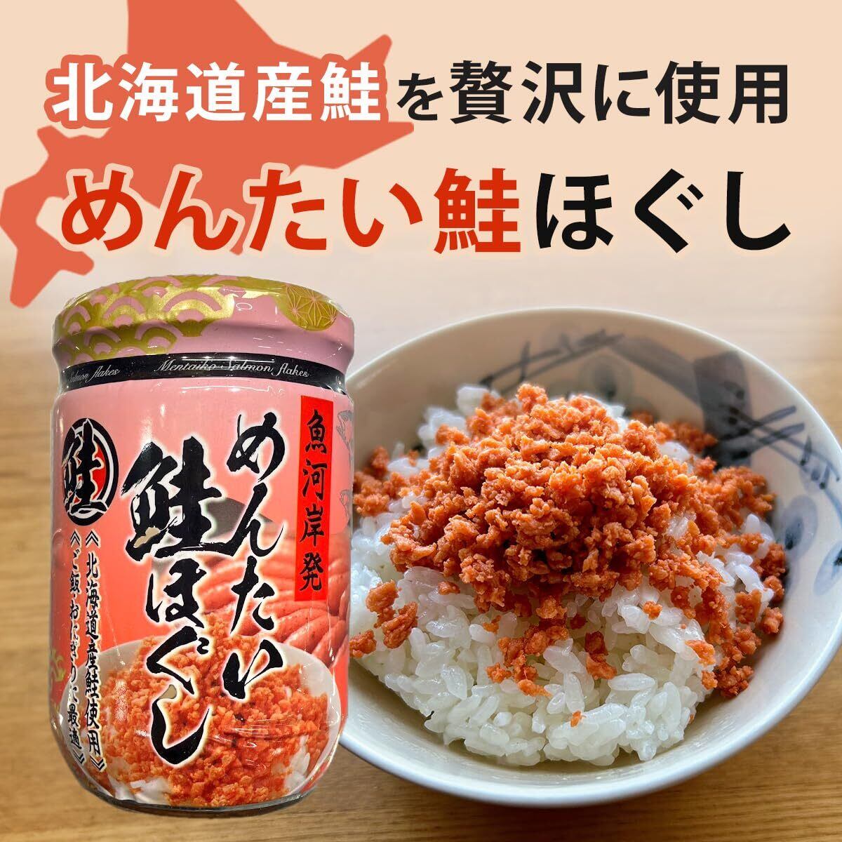 特徴:北海道産鮭を贅沢に使用し、プチプチ食感の明太子と合わせたソフトタイプの鮭フレーク