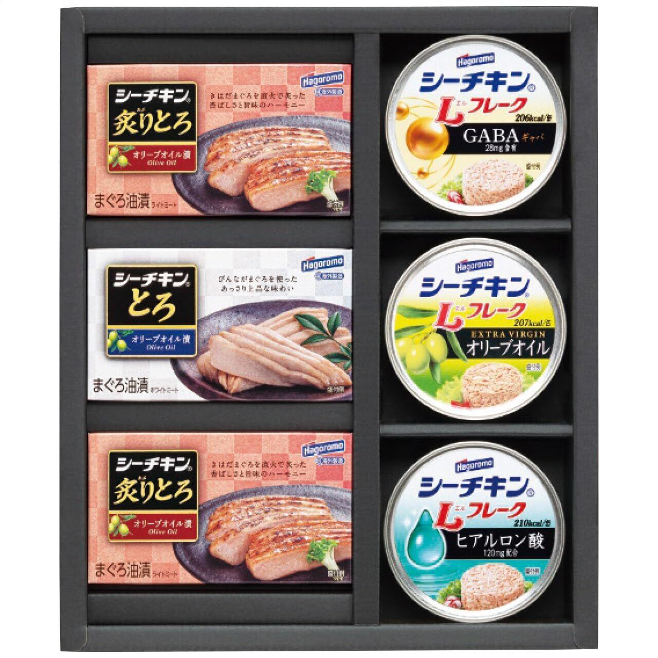 内容:シーチキンとろ(びんなが)オリーブオイル漬1缶・シーチキン炙りとろ(きはだ)オリーブオイル漬2缶・各75g・シーチキンLフレークオリーブオイル・シーチキンLフレークGABA入り・シーチキンLフレークヒアルロン酸入り各1缶・各70g