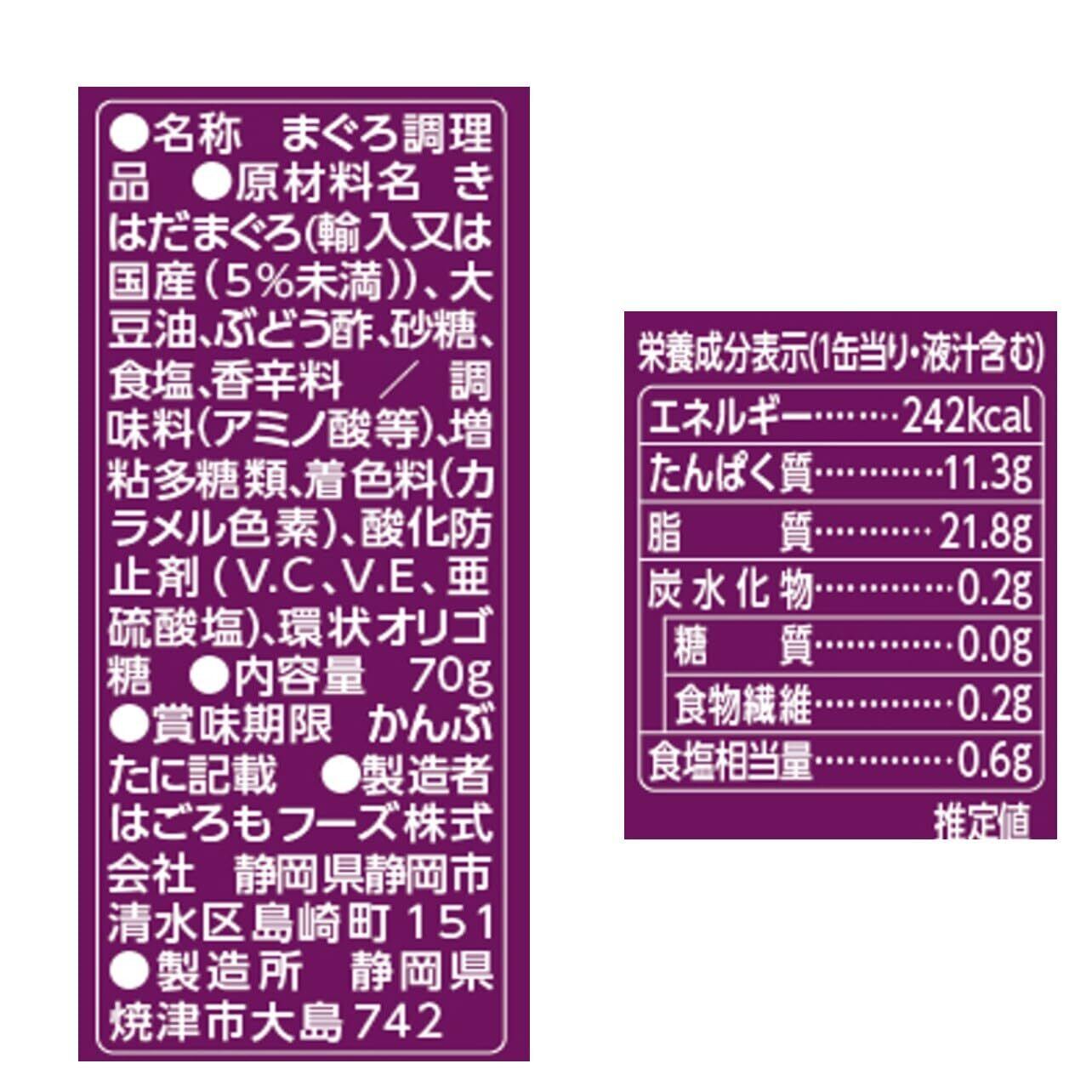 きはだまぐろ(輸入又は国産(5%未満))、大豆油、ぶどう酢、砂糖、食塩、香辛料 / 調味料(アミノ酸等)、増粘多糖類、着色料(カラメル色素)、酸化防止剤(V.C、V.E、亜硫酸塩)、環状オリゴ糖