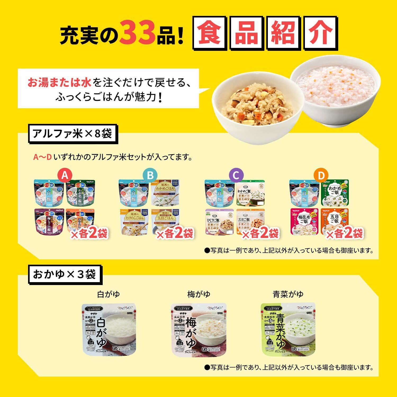 【家族用としても使える9日分!】この非常食セットは33品9日分の大ボリュームです。ご飯からお菓子(パンなど)まで、幅広い年齢層に対応した多彩な備蓄食料を取り揃えています。またこの長期保存食は5年保存可能であるため、災害用の保存食だけでなくアウトドアやキャンプなど、様々なシーンで活躍します。ご家族皆様の健康を考えた当社の非常食セットをおすすめします。