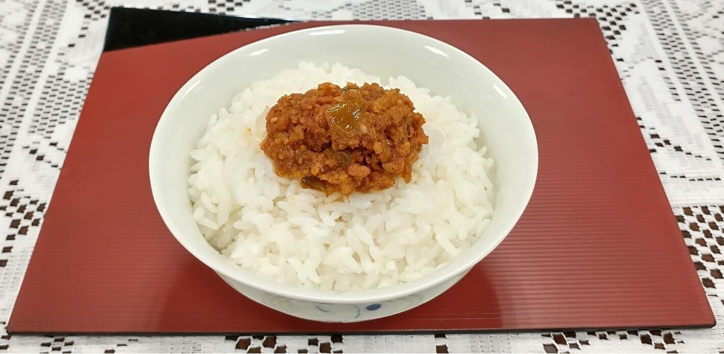 原材料:植物油脂(国内製造)、鮭、粒状大豆たんぱく、砂糖、にんにくの芽、フライドガーリック、醤油、豆板醤、すりごま、唐辛子、食塩/着色料(赤102、黄5)、調味料(アミノ酸等)、香辛料、pH調整剤、(一部に大豆・ごま・鮭・小麦を含む)