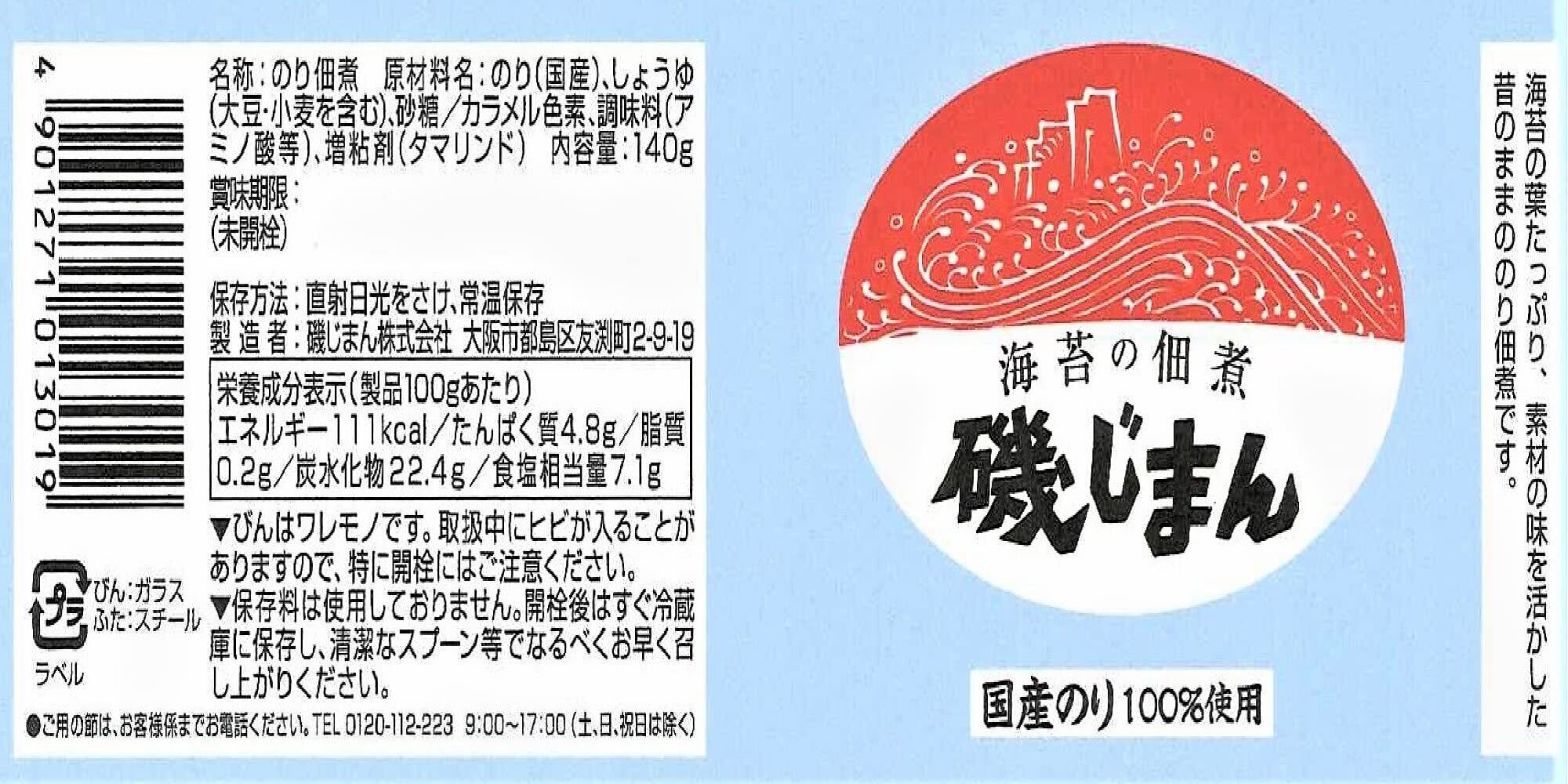 原材料:のり(国産)、しょうゆ(大豆・小麦を含む)、砂糖