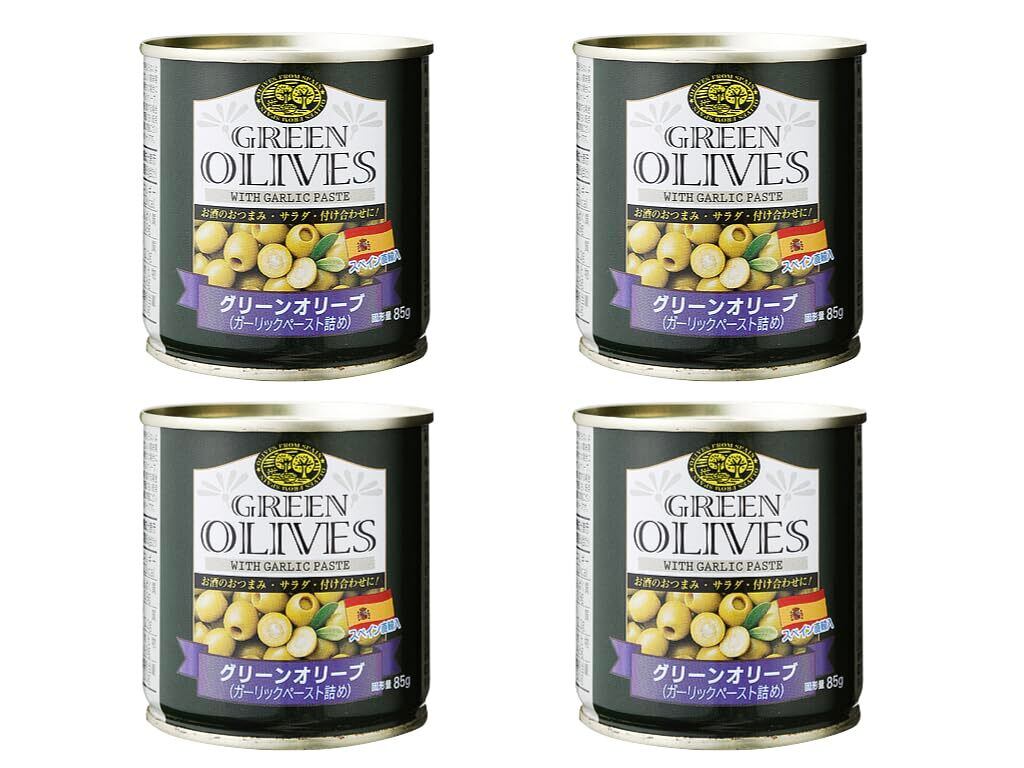 神戸物産 グリーンオリーブ ガーリックペースト詰め GREEN OLIVES WITH GARLIC PASTE オリーブ おつまみ サラダ ピザ パスタ 付け合わせに スペイン産 200g×4缶