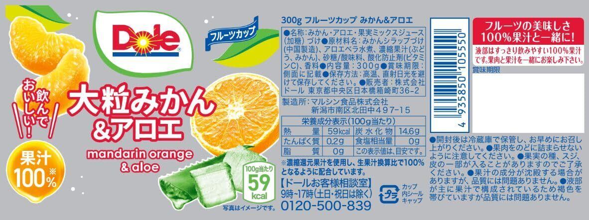 みかんシラップづけ(中国製造)、アロエベラ水煮、濃縮果汁(ぶどう、みかん)、砂糖/酸味料、酸化防止剤(ビタミンC)、香料