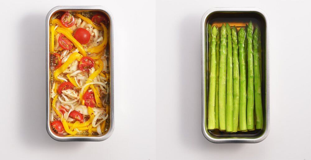 食材の一時保存に便利なフタ付き。常備菜に。作り置きに