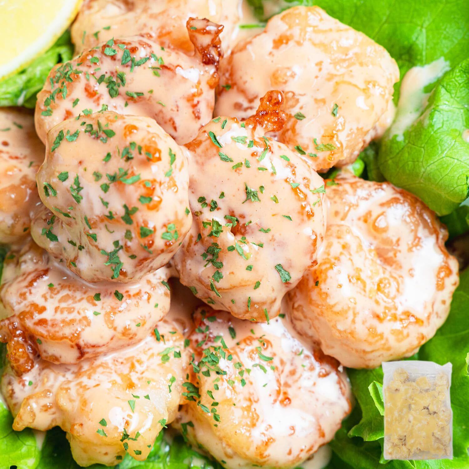 エビフリッターに甘めのマヨソースを混ぜ合わせたエビマヨになります。解凍したままそのまま食べれますが、電子レンジで軽く温めるとさらに美味しくいただけます。(500W 1分40秒・600W 1分20秒)