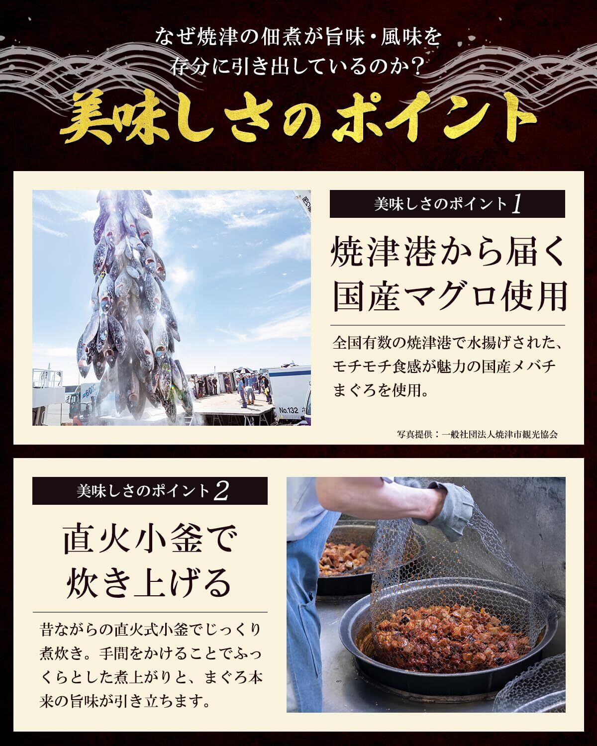 【国産・無添加・手作りにこだわり】静岡県焼津港で水揚げされた国産メバチまぐろを、添加物を使用せず、昔ながらの直火式小釜製法で丁寧に炊き上げました。まぐろ本来の旨味と風味を存分に引き出しています。