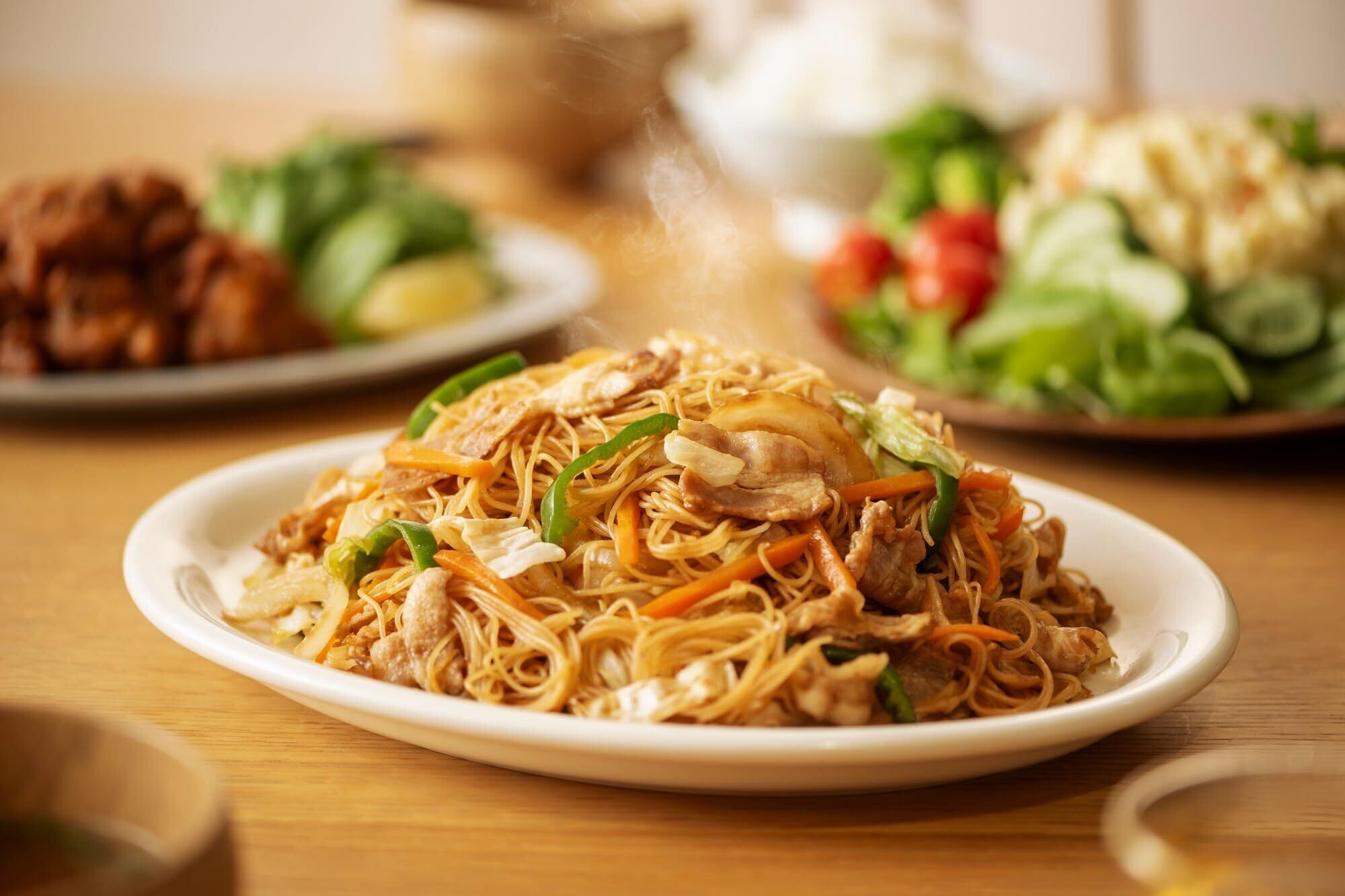 野菜がたっぷり手軽に美味しく食べられる大皿おかずの焼ビーフンです。香味野菜の風味と牡蠣の旨味が広がる濃厚な味わいが特徴です。