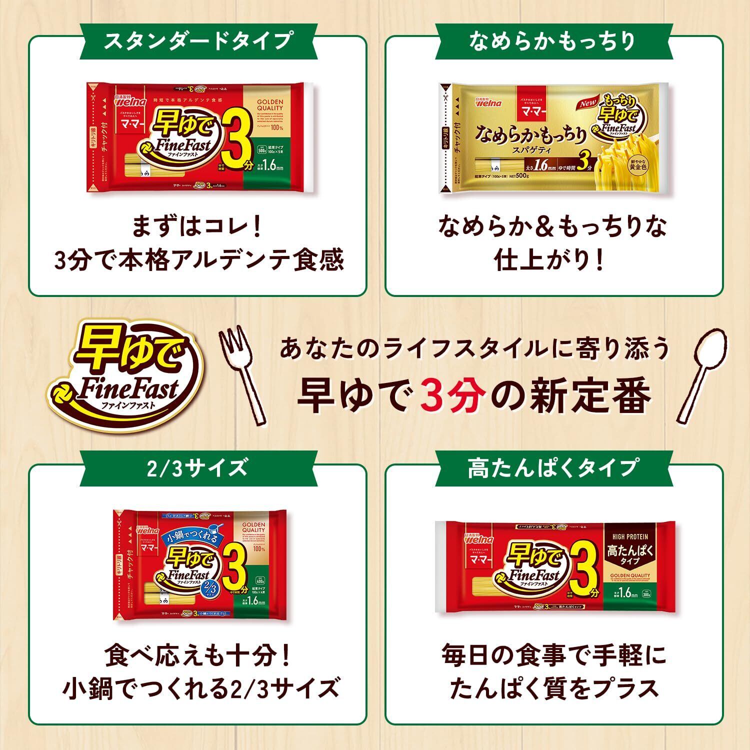 【早ゆで4分で時短調理】たった4分でアルデンテに茹で上がる早ゆでタイプ。忙しい日でもサッと作れて、時間に余裕が生まれます。