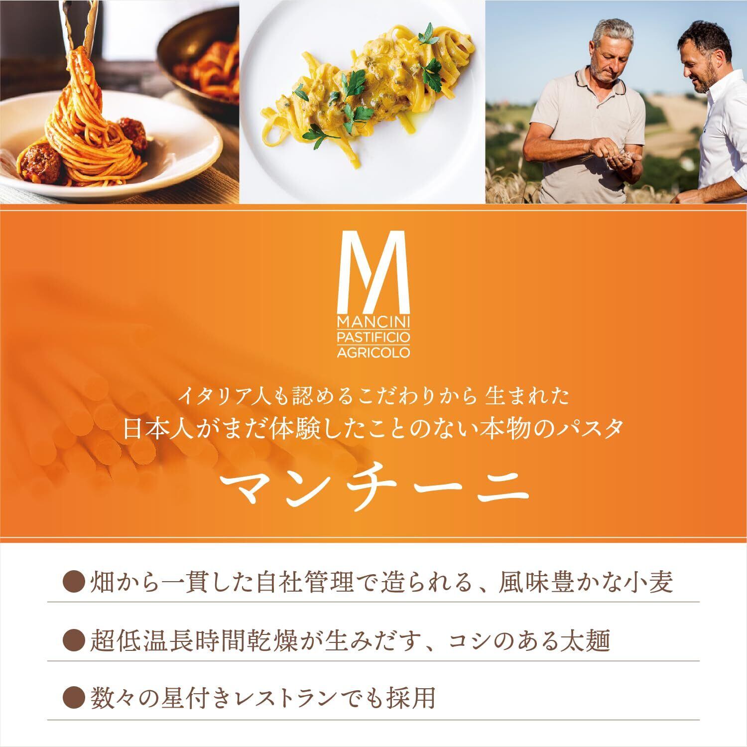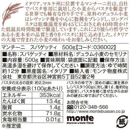 マンチーニ社のパスタはマルケ州産の自社小麦100%。パスタ専用に栽培する原料小麦(レヴァンテ種を中心とする)を数種ブレンドし、低温長時間乾燥によって小麦の風味をパスタに封じ込めています。「スパゲッティ」は、「1本の糸、弦」というのが名前の由来で、世界でもっとも人気の形。一般的にトマトやバジルのソースとよく合います。