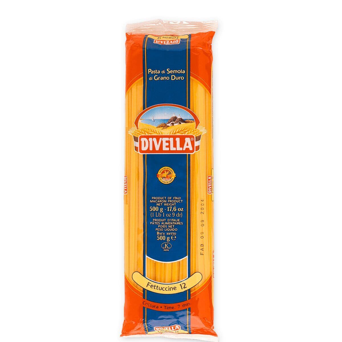 創業100年以上の歴史あるパスタメーカーディヴェッラ社のパスタは南イタリアで最も食べられているイタリア消費者連合会【品質比較テスト】で最高点を獲得アルデンテが長持ちする特性があります。平たい麺です。トマトやクリームの濃厚ソースに良く絡みます。高品質の原料(小麦)を使用。