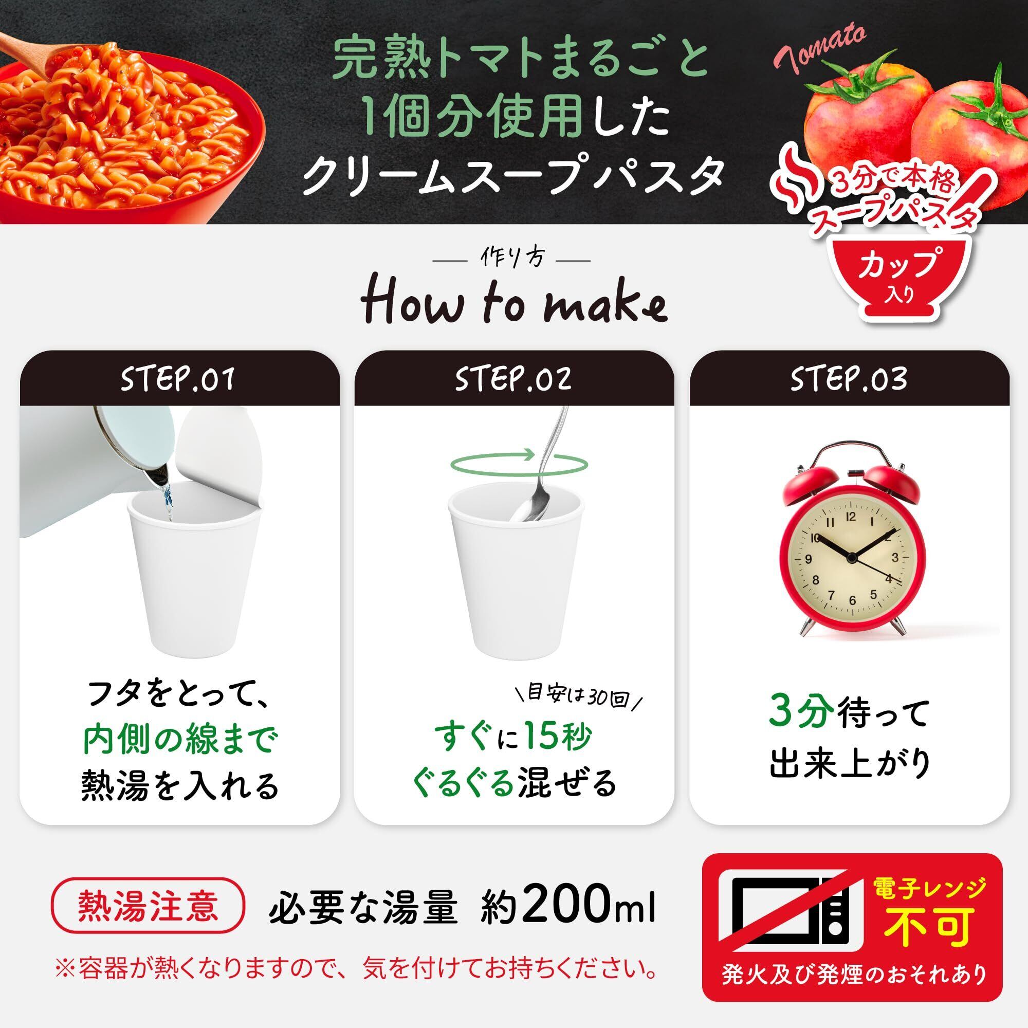 パスタ(ベルギー製造)、トマトパウダー、砂糖、マッシュポテト、デキストリン、でん粉、食塩、乾燥トマト、クリーミングパウダー、食用加工油脂、トマトエキス、香辛料、チーズパウダー、あさりエキス、たらパウダー、大豆発酵調味料、たん白加水分解物、野菜エキス調味料/調味料(アミノ酸等)、キサンタンガム、酸味料、(一部に小麦・乳成分・大豆・鶏肉を含む)