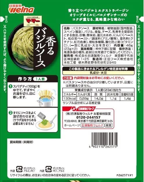 植物油脂(国内製造、スペイン製造)、バジル、食塩、チーズ、乳等を主要原料とする食品、砂糖、香味油、還元水あめ、にんにくペースト、松の実ペースト/調味料(アミノ酸等)、着色料(クチナシ、紅花色素)、増粘多糖類、酸化防止剤(ビタミンC)、(一部に乳成分・大豆を含む)
