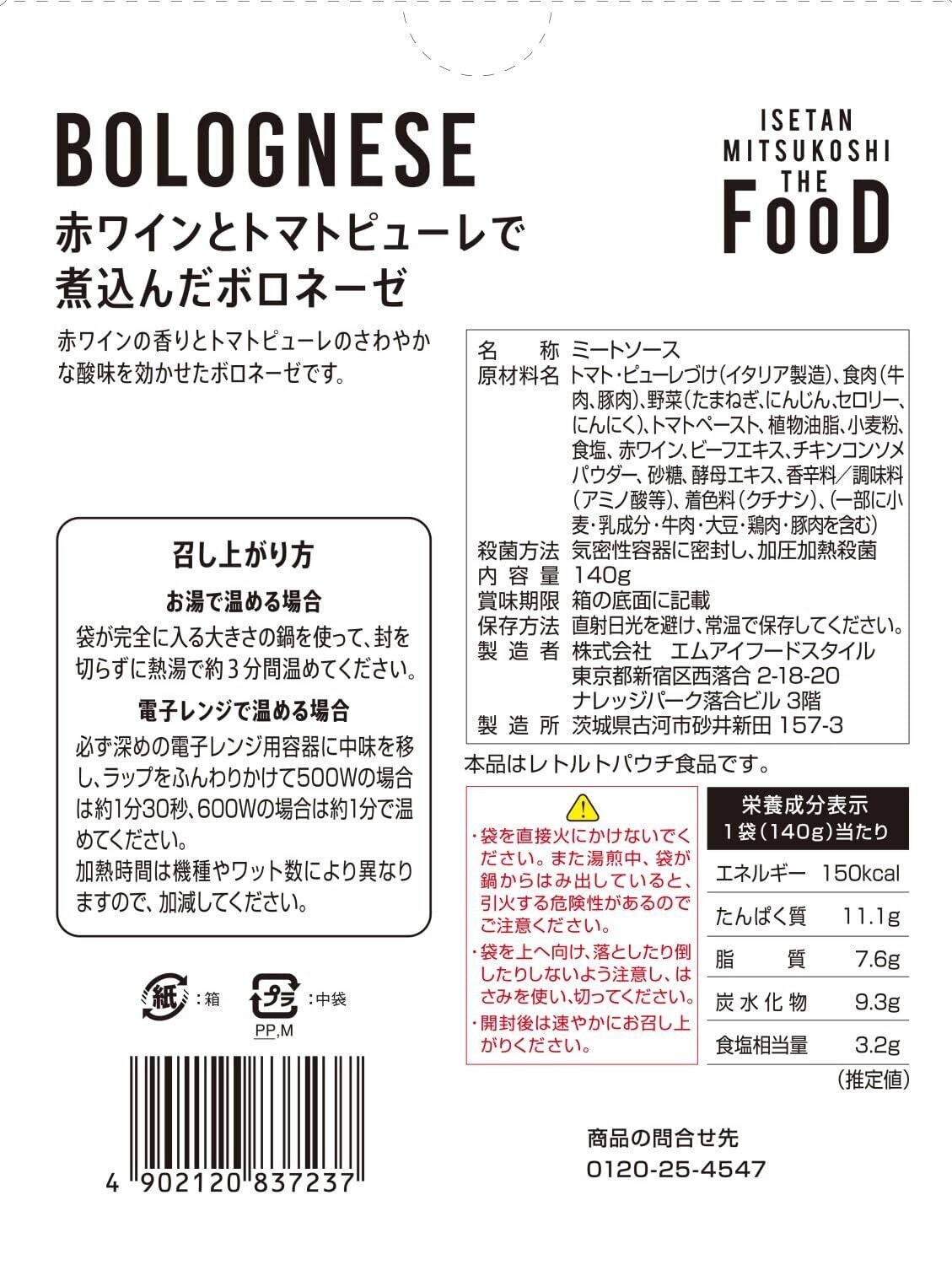 各カテゴリーのバイヤーが全国を巡り、食への好奇心に応えるために生まれた三越伊勢丹のプライベートブランド「ISETAN MITSUKOSHI THE FOOD」。じっくり煮込むことで生まれる赤ワインのコクと香り、トマトピューレの爽やかな酸味が特徴のボロネーゼです。