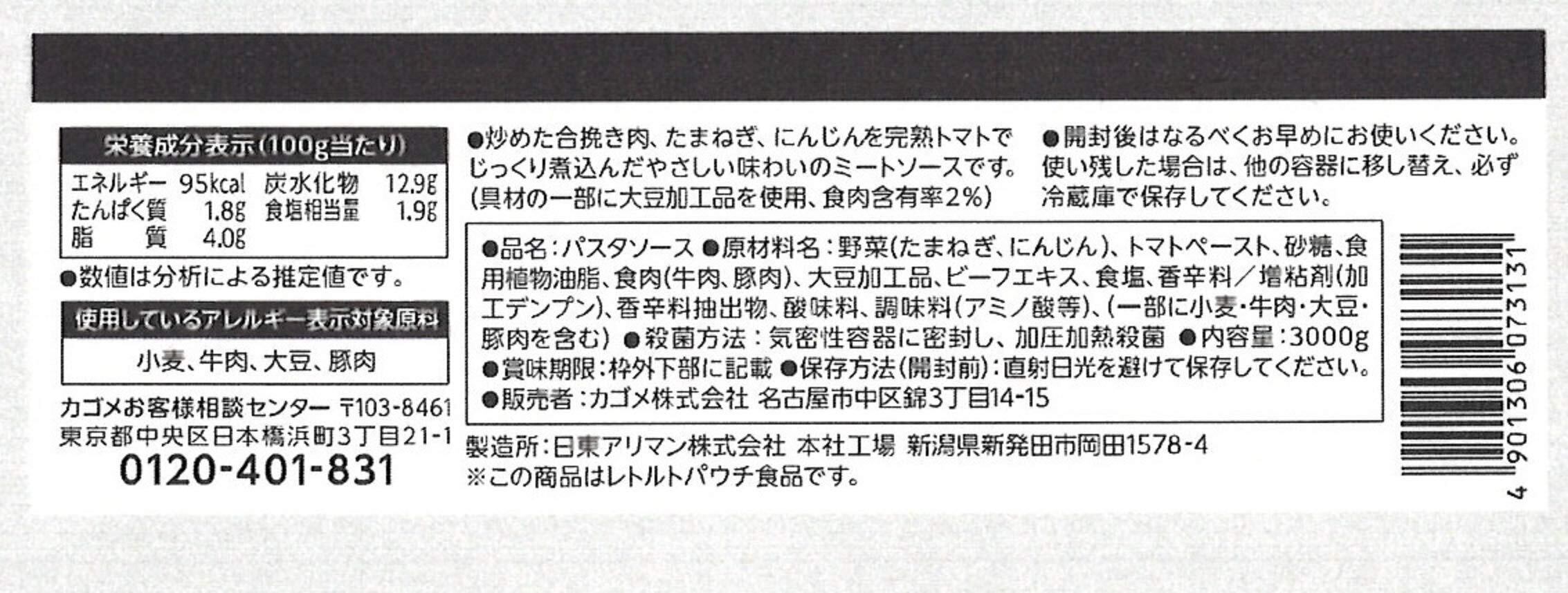 原材料:野菜(たまねぎ、にんじん)、トマトペースト、砂糖、食用植物油脂、食肉(牛肉、豚肉)、大豆加工品、ビーフエキス、食塩、香辛料/増粘剤(加工デンプン)、香辛料抽出物、酸味料、調味料(アミノ酸等)、(一部に小麦・牛肉・大豆・豚肉を含む)