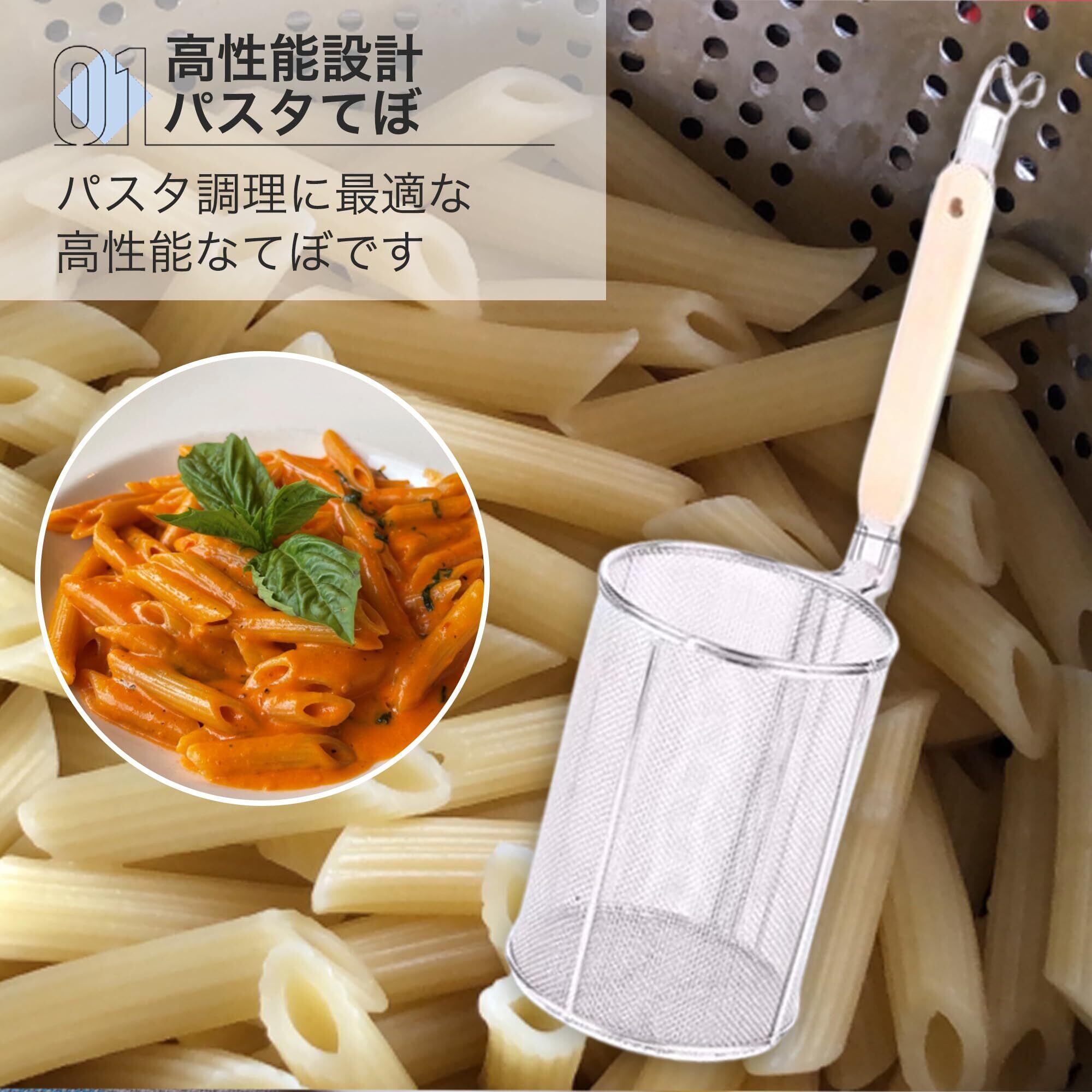 【高性能設計パスタてぼ】 パスタ調理に最適な高性能なてぼです。細麺も逃さないメッシュ構造で、スパゲティやフィットチーネなど様々なパスタの湯切りをスムーズに行えます。