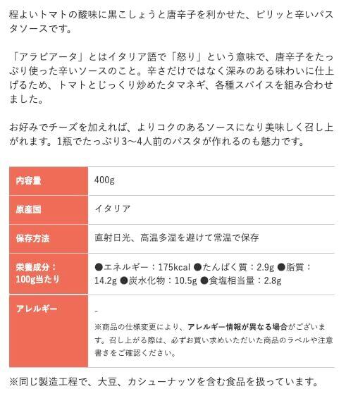 程よいトマトの酸味に黒こしょうと唐辛子を利かせた、ピリッと辛いパスタソースです。 「アラビアータ」とはイタリア語で「怒り」という意味で、唐辛子をたっぷり使った辛いソースのこと。辛さだけではなく深みのある味わいに仕上げるため、トマトとじっくり炒めたタマネギ、各種スパイスを組み合わせました。 お好みでチーズを加えれば、よりコクのあるソースになり美味しく召し上がれます。1瓶でたっぷり3~4人前のパスタが作れるのも魅力です。