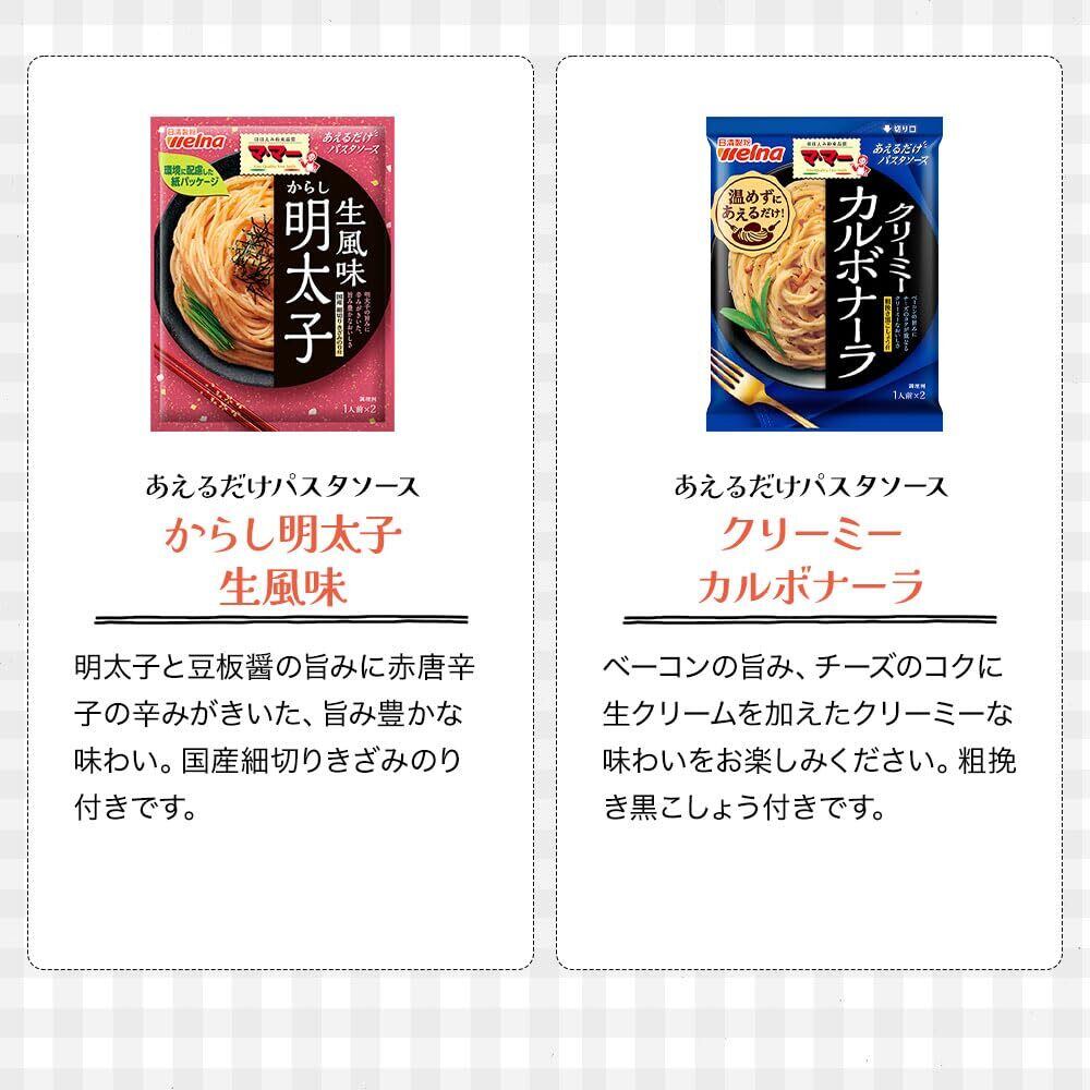 キューピー、マ・マー、オーマイ、S&Bなど有名メーカーのあえるパスタを組み合わせ。単品では選ばない味にも出会える構成で、8種16食入りのため、味の系統や気分に合わせて最後まで飽きずに楽しめます。