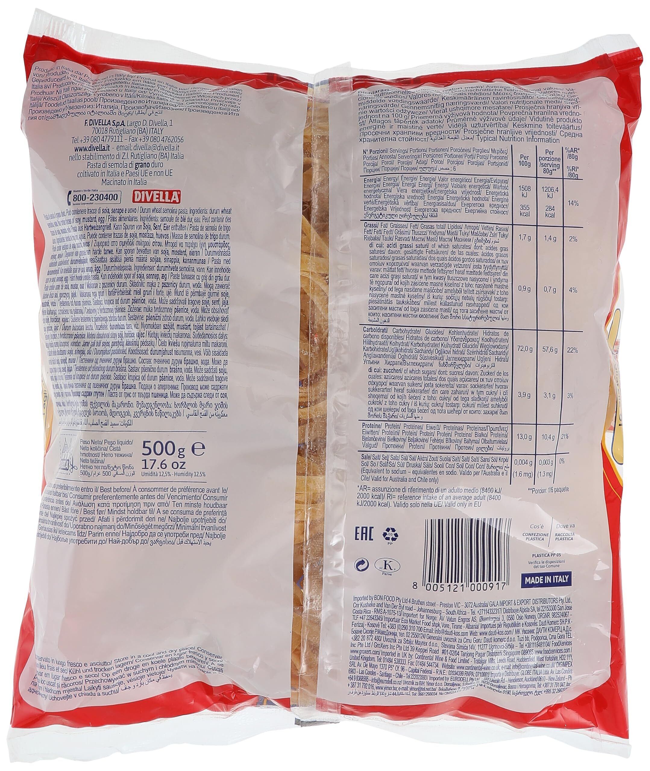 1890年創業の南イタリアでトップのシェアを誇るDIVELLAのパスタは、南部イタリア産を中心とした良質なデュラム小麦を使用しております。「イタリア全国消費者連合会」のパスタ品質テストにおいて総合評価で最高点を獲得、本場でも愛される美味しさです。アルデンテが持続する伸びにくいパスタです。平たい麺は濃厚なクリームソースやミートソース(ラグーソース)によくあいます。