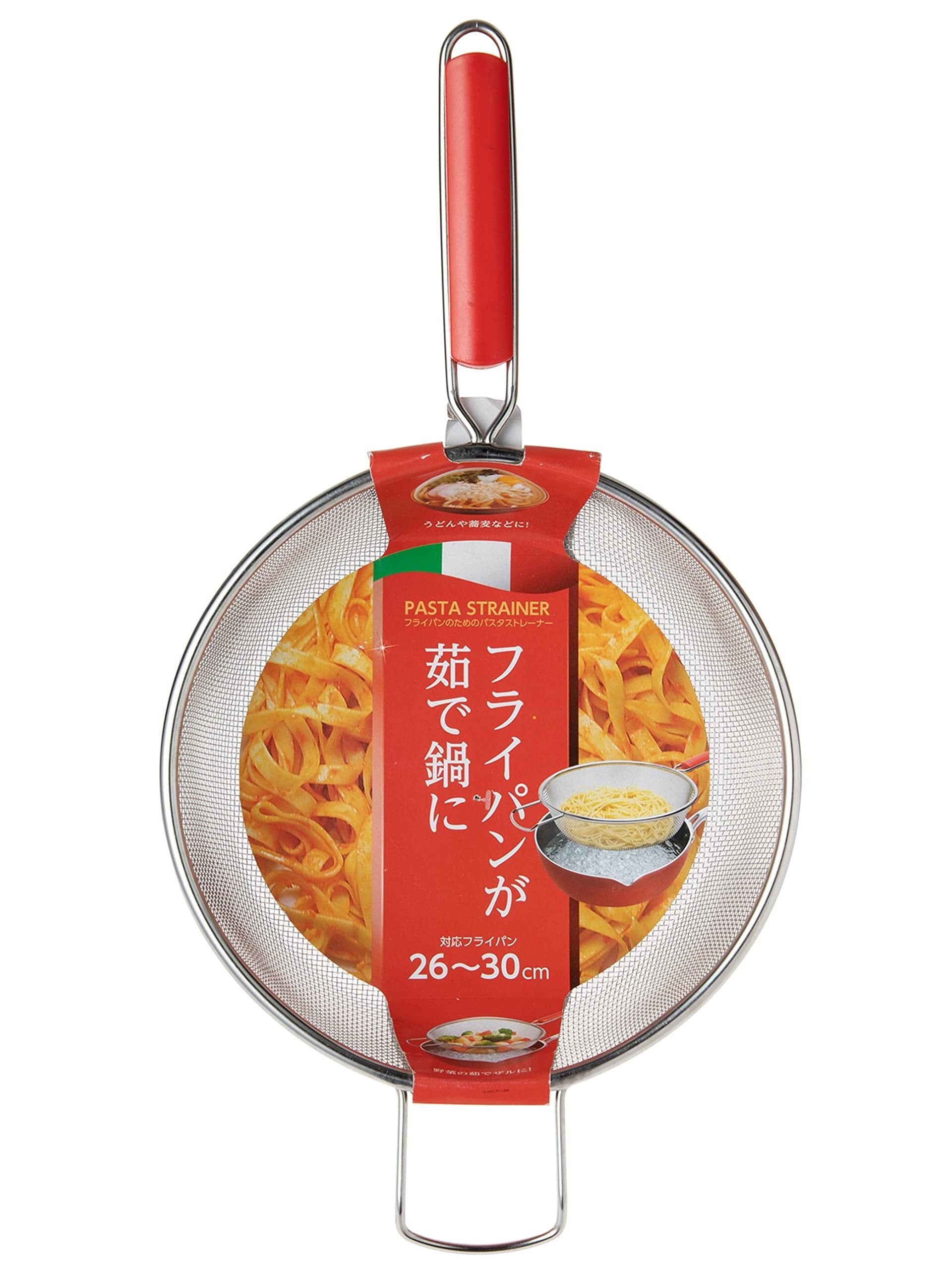 ストリックスデザイン 茹でザル パスタストレーナー レッド 26~30cmのフライパン対応 ゆでざる 取っ手付き 麺や野菜に ステンレス製 SA-029