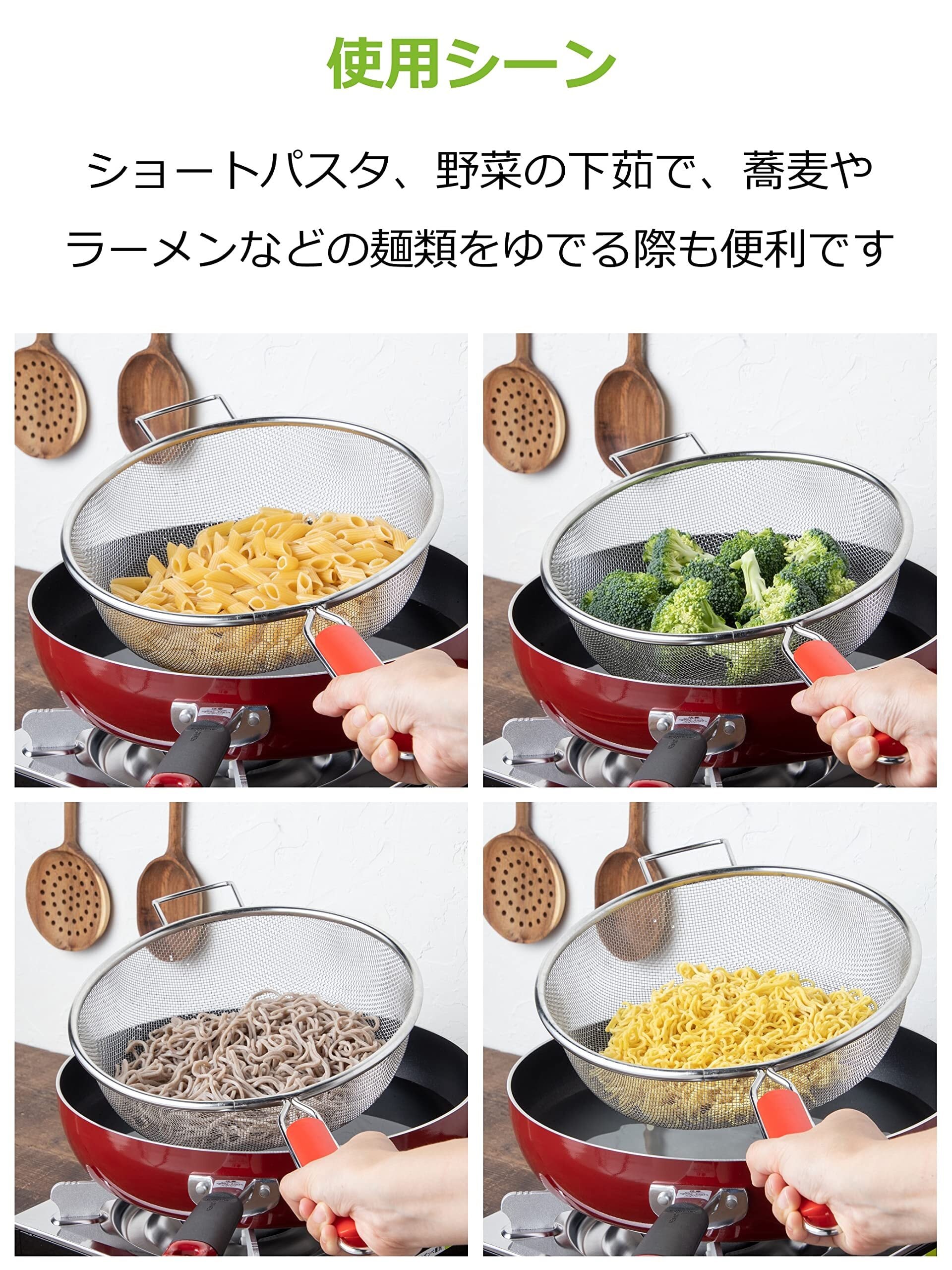 ●パスタだけではなく、うどんやお蕎麦、野菜などの茹でザルとしてもご利用いただけます。