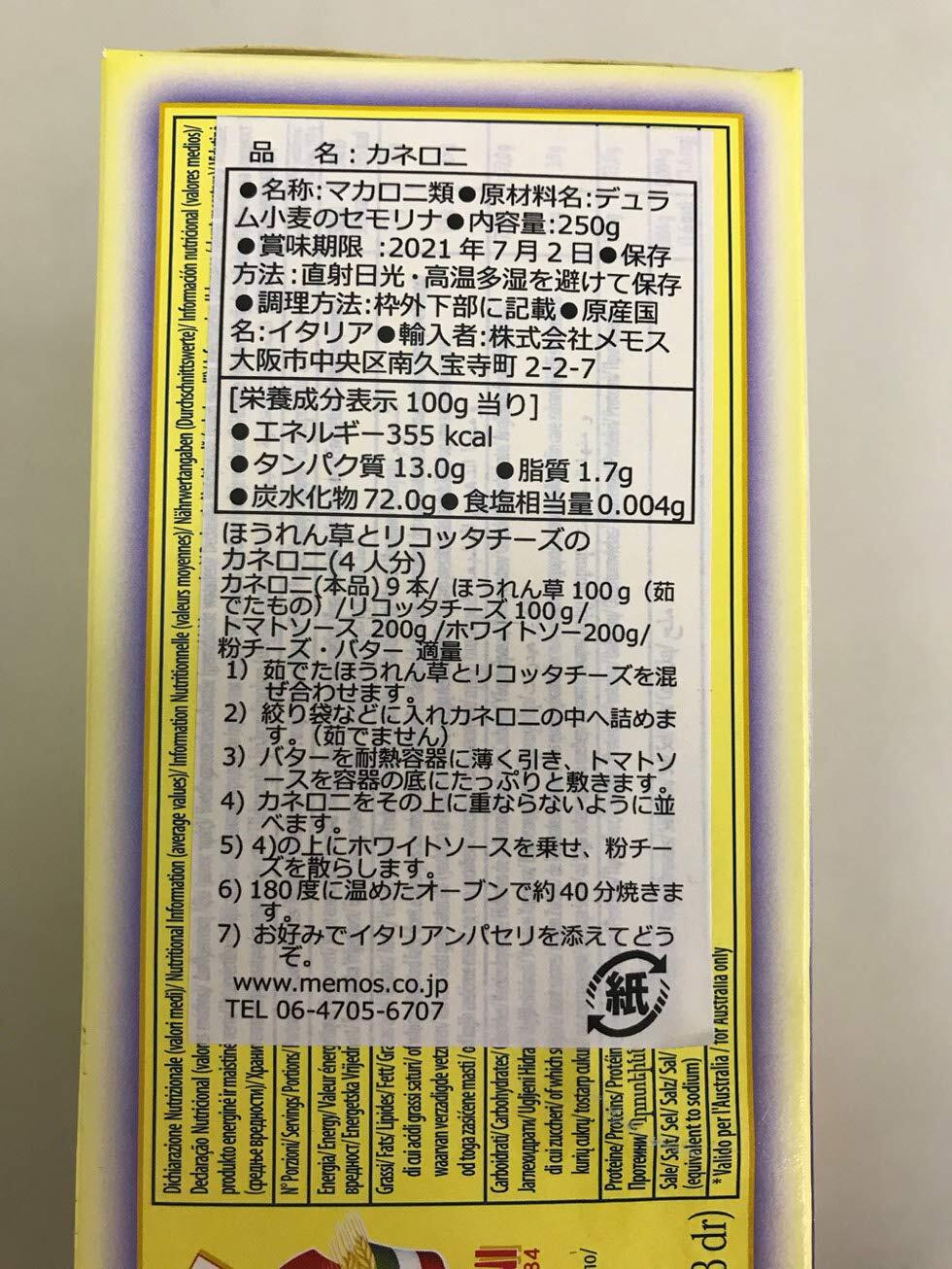 南イタリアDIVELLA社製のカネロニです。「カネロニ」は大きなパイプやストローという意味。下茹で不要です。中に詰め物をし、オーブンで焼いてください。存在感のあるプリもピアットに。ほうれん草とリコッタチーズや、牛挽肉を詰めるのが人気。トマトソースを下に、ベシャメルソースを上にかけるのが典型的な食べ方。