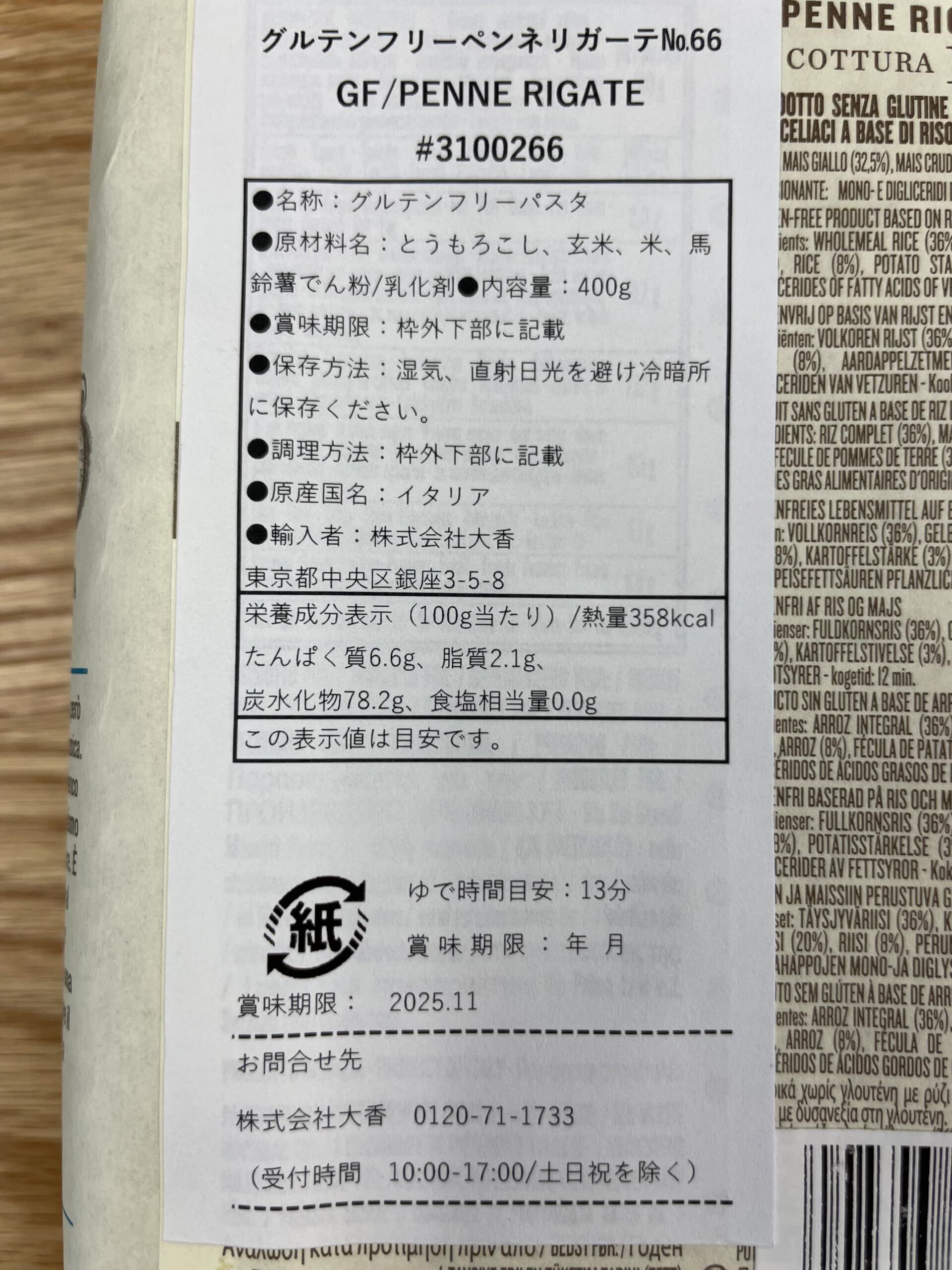 大香 No.66 RUMMO GLUTEN FREE PENNE RIGATE(ルンモ グルテンフリー ペンネリガーテ) 400g×2袋