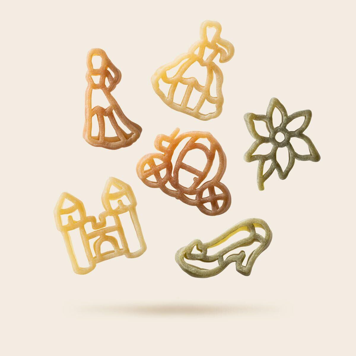 オーロラ姫、お花、シンデレラ、かぼちゃの馬車、ガラスの靴、白雪姫、ベル、お城の形をしたかわいらしいオーガニックのショートパスタ。