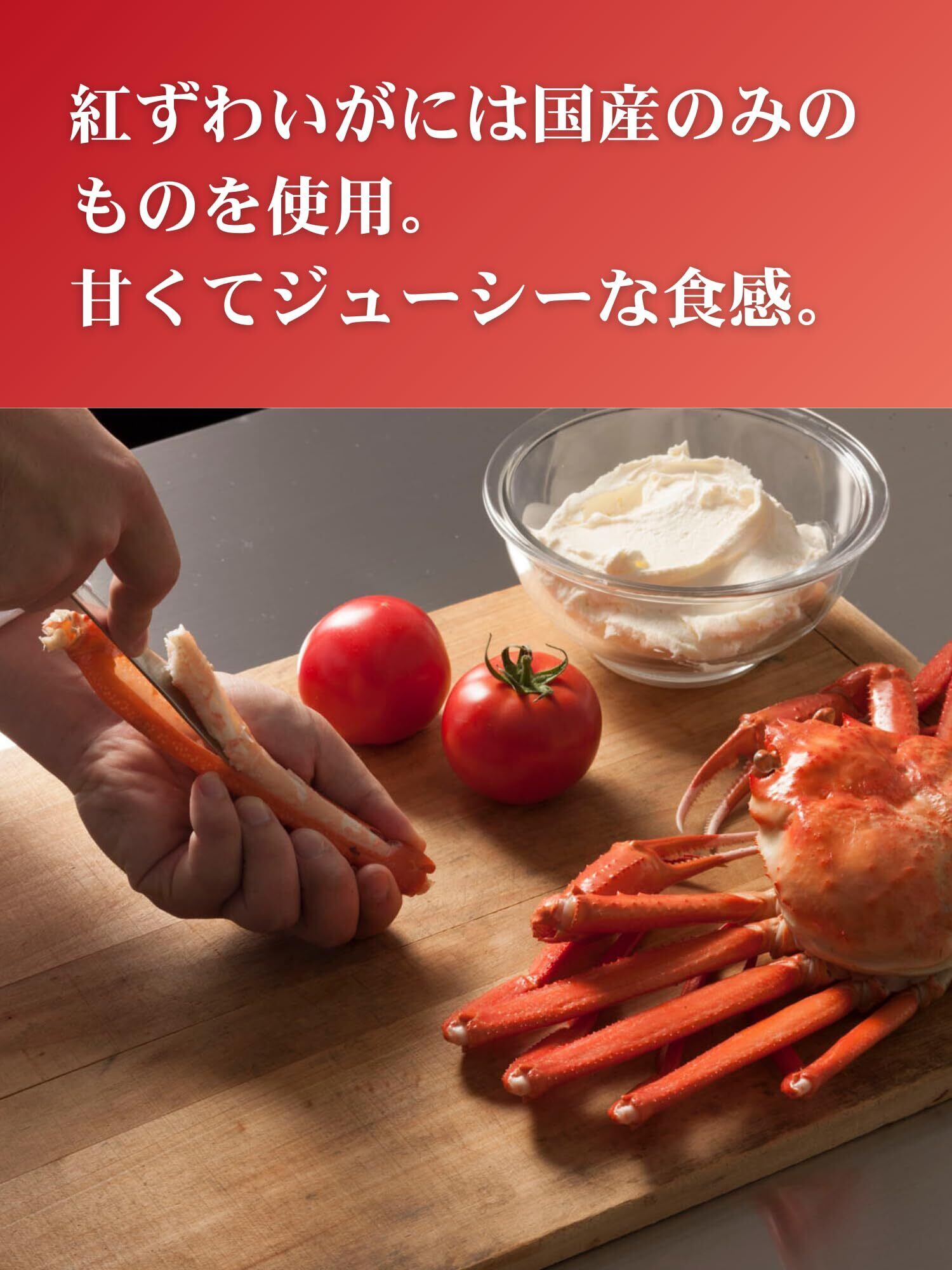 ・かにトマトクリームソース 【国産紅ずわいがにを使用】国内で水揚げされた紅ずわいがにだけを使用しています。紅ずわいがには甘くてジューシーな食感が特徴です。【こだわりのトマトソース】味のベースとなるトマトソースには、コクのあるトマトペーストとさわやかな酸味のダイストマトの2種類をバランス良くブレンドしています。【クリームのコクと白ワインのキレ】かに、トマト、クリームの味のバランスにこだわりました。生クリームを使ったコクのある深い味わいに、白ワインを加えてすっきりと上品な味わいに仕上げました。【おすすめの召しあがり方】おすすめのパスタは、スパゲッティ-ニ(1.6mm程度)や、平打ちタイプのタリアテッレなどのロングパスタです。お好みでサラダや白ワインなどと合わせて、休日のディナーやランチにお楽しみください。