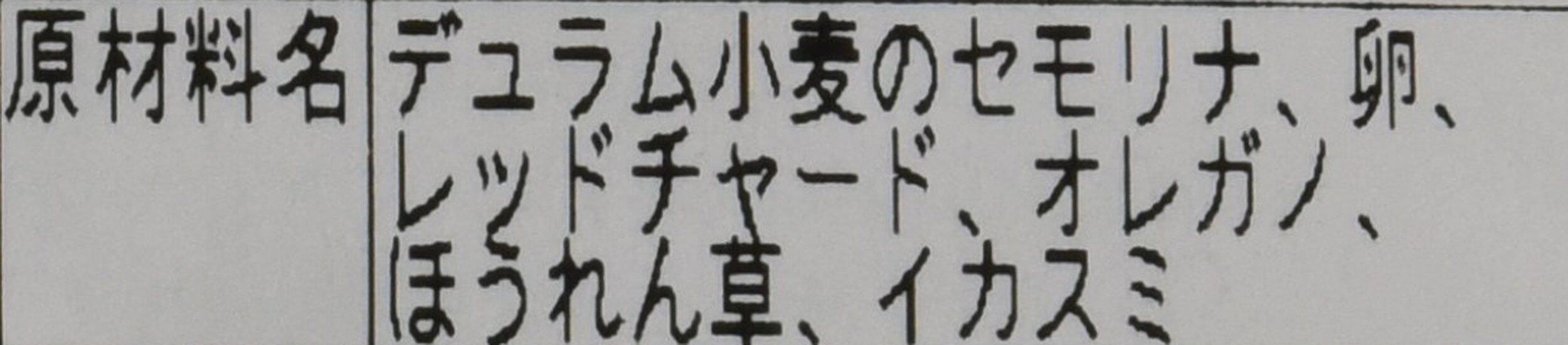 原材料:デュラム小麦のセモリナ、卵、レッドチャード、オレガノ、ほうれん草、イカスミ