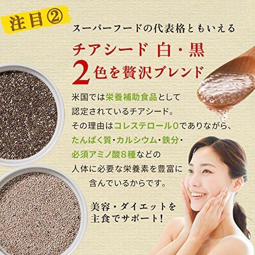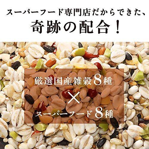 原料:もち麦(アメリカ産)、丸麦(大麦)(国産)、押し麦(大麦(国産))、キヌア、アマランサス、チアシード白、発芽玄米(国産)、金ごま、青大豆(国産)、小豆(国産)、大豆(国産)、赤米(国産)、チアシード黒、黒ごま、黒米(国産)、白ごま
