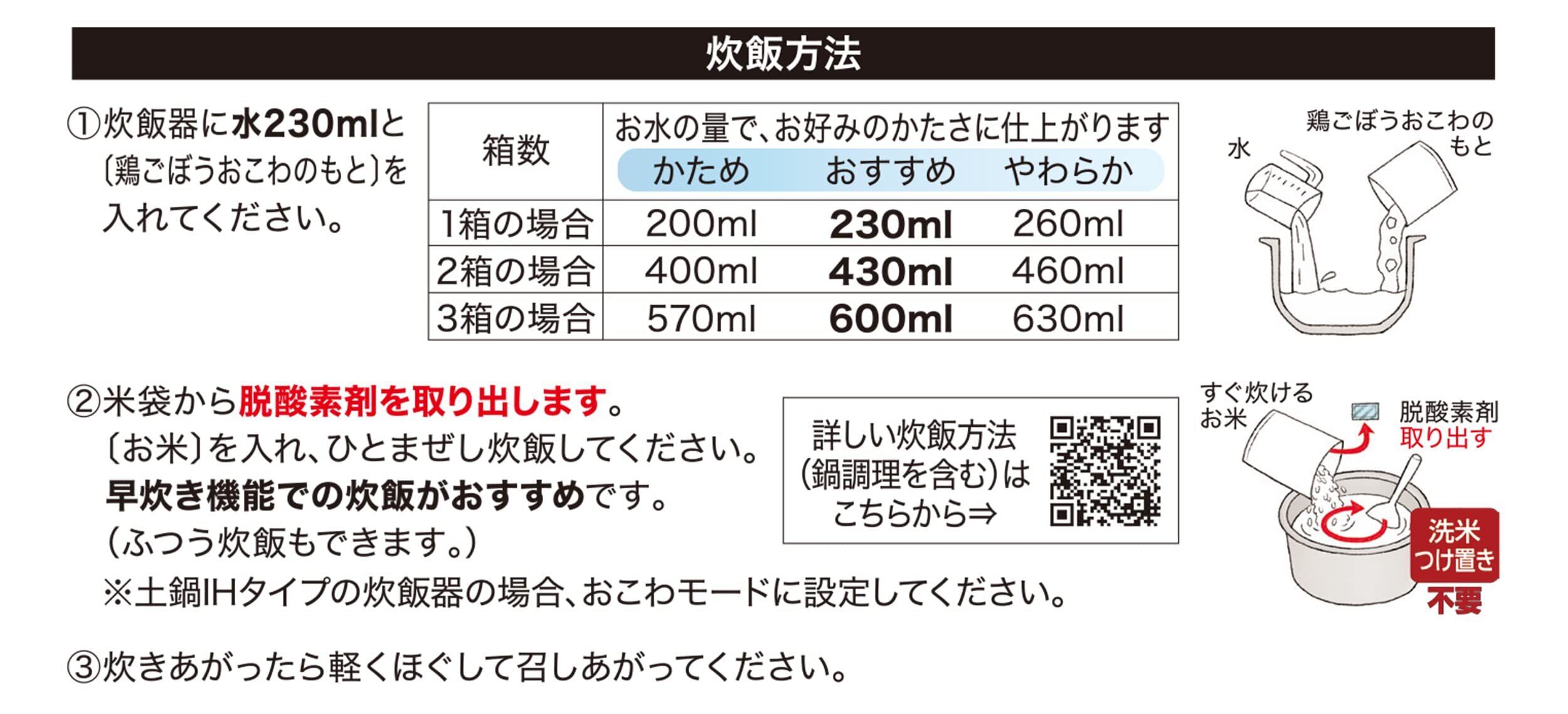 ・内容量340g(乾燥米飯230g、鶏ごぼうおこわのもと110g)