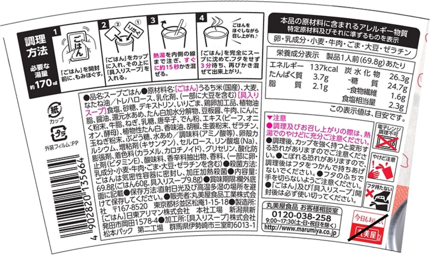 [ごはん]うるち米(国産)、大麦、なたね油/トレハロース、乳化剤、(一部に大豆を含む)|[具入りスープ]食塩、砂糖、デキストリン、いりごま、鶏卵加工品、植物油脂、醤油、還元水あめ、たん白加水分解物、豆板醤、牛肉、にんにく粉末、牛脂、ねぎ、乳糖、唐辛子、でん粉、エキス(ビーフ、オニオン、酵母)、植物性たん白、香味油、胡椒、生姜粉末、ゼラチン、玉ねぎ粉末、ぶどう糖、水あめ/調味料(アミノ酸等)、卵殻カルシウム、増粘剤(キサンタン)、セルロース、リン酸塩(Na)、膨張剤、着色料(カラメル、カロチノイド)、グリセリン、酸化防止剤(ビタミンE)、酸味料、香辛料抽出物、香料、(一部に卵・乳成分・小麦・牛肉・ごま・大豆・ゼラチンを含む)