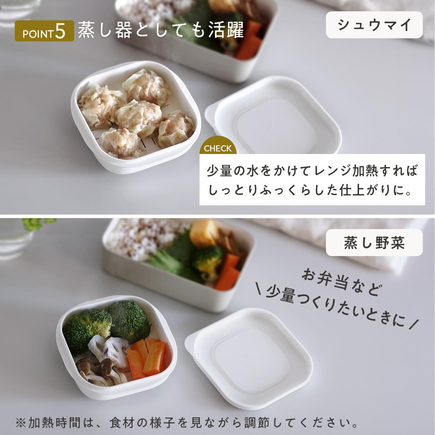 【蒸し器としても】シュウマイや蒸し野菜、お弁当など少量作りたいときの蒸し器としてもご使用いただけます。※加熱時間は食材のご様子を見ながら調整してください。